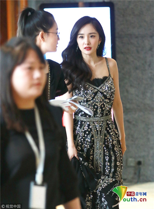 楊冪卷發(fā)成熟美露香肩 自提裙擺過酒店大堂