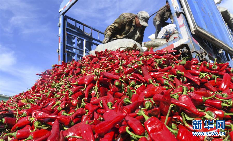9月19日,在吉林省白城市通榆縣,農民在分揀收獲的辣椒。 新華社記者 張楠 攝
