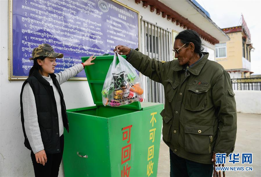 西藏阿里地區(qū)普蘭縣巴嘎鄉(xiāng)居民(右)在“垃圾銀行”兌換點工作人員指引下,將垃圾丟入分類箱中(9月13日攝)。 生活垃圾1袋可兌換胸牌1個,2袋可兌換鑰匙扣1個,可回收垃圾1袋可兌換抽紙1包或濕巾1袋……近日,記者在西藏阿里地區(qū)普蘭縣巴嘎鄉(xiāng)神山圣湖景區(qū)看到,一些游客領取環(huán)保袋在景區(qū)內撿垃圾后,拿去兌換西藏特色紀念品。 這一切,得益于當地開設的“垃圾銀行”。今年6月,巴嘎鄉(xiāng)在神山圣湖景區(qū)開設“垃圾銀行”,鼓勵游客和群眾拾撿垃圾兌換獎品,破解景區(qū)垃圾收運難題,取得良好效果。 新華社記者劉東君攝