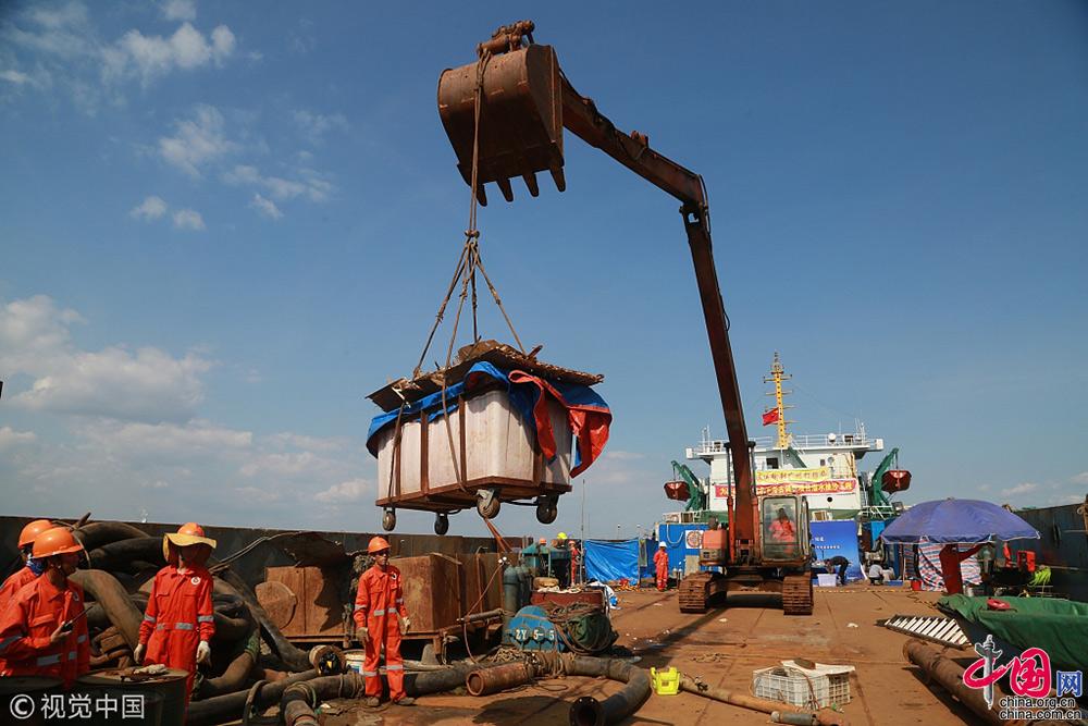 2018年9月25日,遼寧大連,考古工作人員把出水的經(jīng)遠艦遺物進行轉(zhuǎn)運。視覺中國