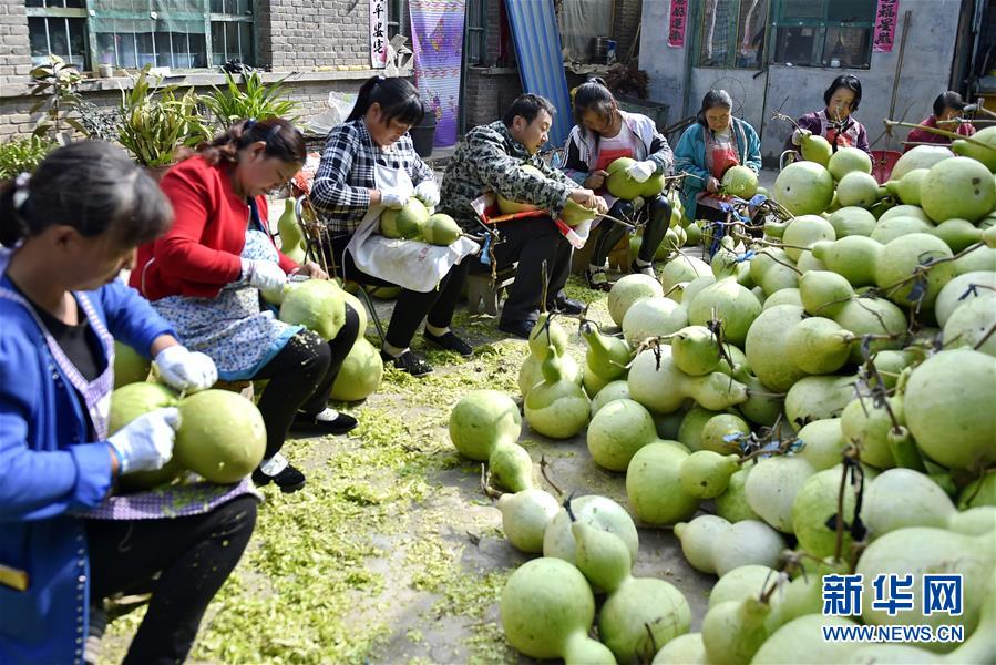 9月27日,山西省安澤縣和川鎮(zhèn)孔旺村的村民將葫蘆去皮。近日,山西省安澤縣和川鎮(zhèn)孔旺村種植的葫蘆喜獲豐收,村民們忙著將摘下的葫蘆去皮晾干。孔旺村于2016年成立葫蘆種植合作社,種植、采摘、加工等環(huán)節(jié)全部由貧困戶負責,為貧困戶拓寬增收渠道。新華社記者 曹陽 攝