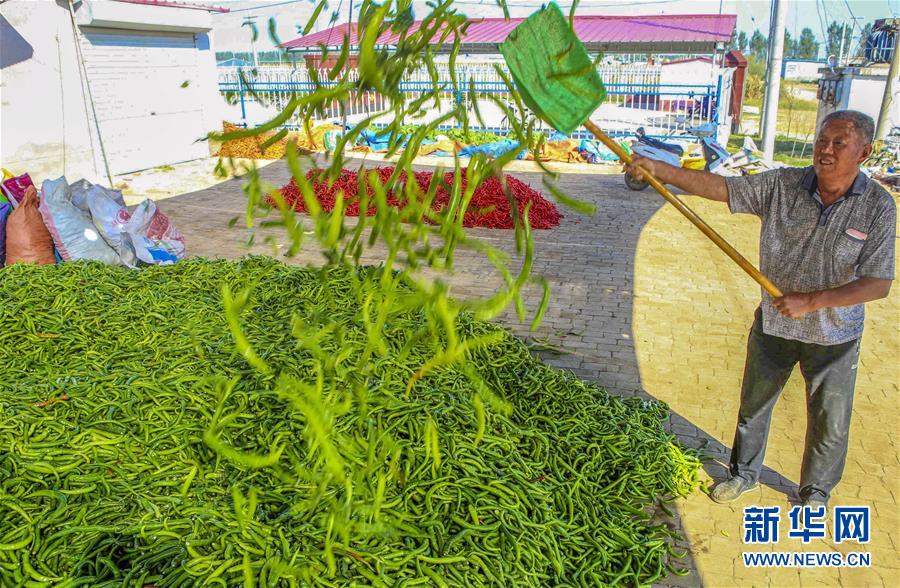 9月28日,饒陽縣留楚鄉(xiāng)影林村的種植戶在翻晾辣椒。 近年來,河北省饒陽縣結(jié)合市場需求,積極引進(jìn)特色品種辣椒種植,開辟出一條農(nóng)民增收致富新路。目前,該縣特色辣椒種植面積1000余畝,種植戶年均增收3000余元。 新華社記者 李曉果攝