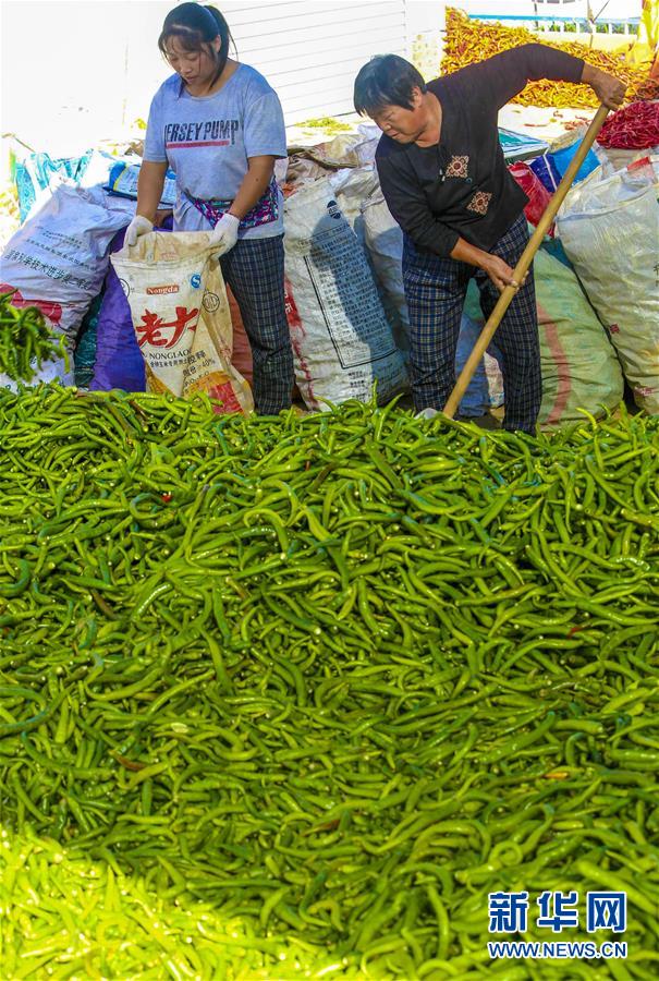 9月28日,饒陽縣留楚鄉(xiāng)影林村的種植戶在將辣椒裝袋。 近年來,河北省饒陽縣結(jié)合市場需求,積極引進(jìn)特色品種辣椒種植,開辟出一條農(nóng)民增收致富新路。目前,該縣特色辣椒種植面積1000余畝,種植戶年均增收3000余元。 新華社記者 李曉果攝