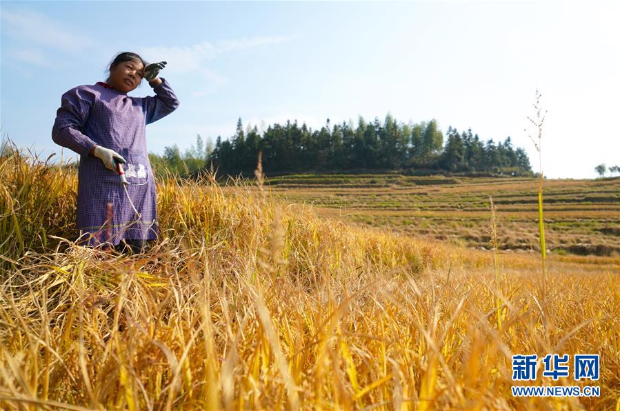 10月9日,一名村民在上堡鄉(xiāng)的高山梯田割稻。