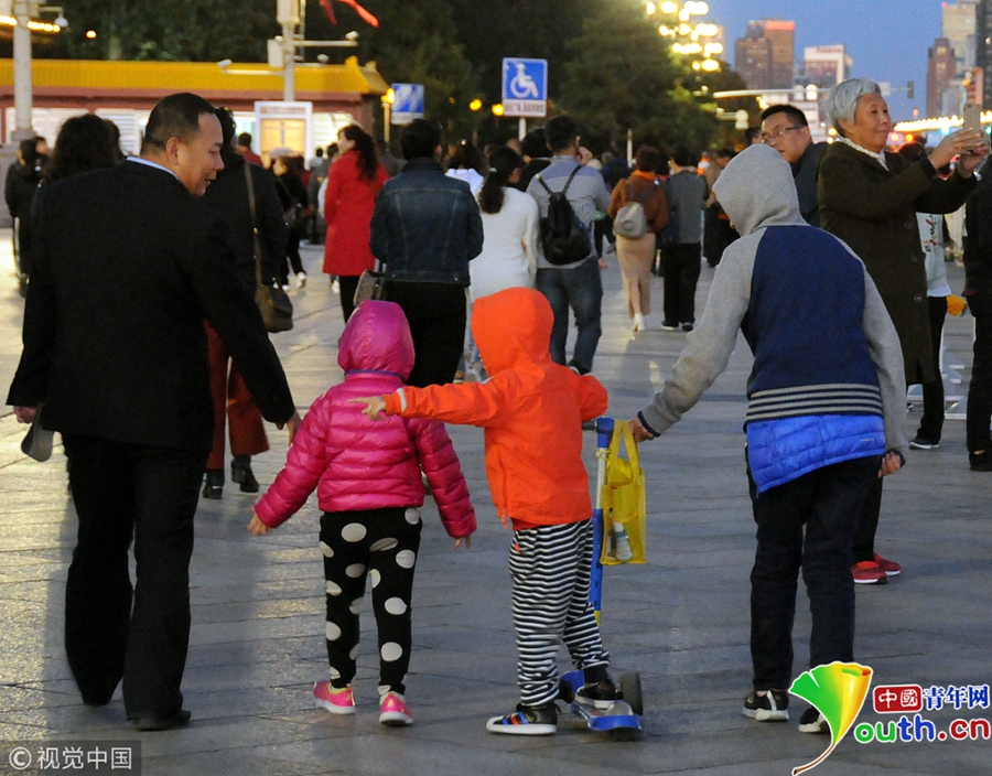 中國(guó)青年網(wǎng)北京10月10日電 2018年10月9日,北京,游客紛紛著秋冬裝游覽天安門(mén)廣場(chǎng)。當(dāng)天北京冷空氣來(lái)襲。圖片來(lái)源:視覺(jué)中國(guó)