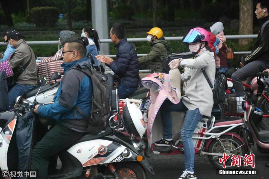 2018年10月9日,山東濟南,昨日一場秋雨過后開始降溫,今天清晨最低氣溫只有6度,馬路上不少上班族穿上羽絨服騎車趕上班路。 圖片來源:視覺中國