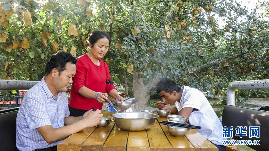 甘永軍(左一)在地處新疆阿克蘇地區(qū)柯柯牙綠化工程內的果園吃飯(2017年9月22日攝)。10年前,甘永軍還在果園開起了第一個農家樂,帶動周邊100多戶果農經營起了自家庭院。 在世界第二大流動性沙漠——塔克拉瑪干沙漠西北邊,一條逾百萬畝的人工林帶傲然挺立。 這條林帶就是柯柯牙荒漠綠化工程。它是新疆阿克蘇黃沙漫漫和碧波萬頃的分界嶺。 1986年,為改變惡劣的自然條件,阿克蘇啟動柯柯牙綠化工程。30年間,各族干部群眾攜手奮斗,曾是沙塵暴策源地的柯柯牙綠樹成蔭;并以此為原點,在南疆戈壁荒灘上孕育出百萬畝的“綠海”。 30多年來,阿克蘇打造出“人走政不息”的樣本,使綠色發(fā)展理念成為幾代人的廣泛共識;“自力更生、艱苦奮斗、無私奉獻”的柯柯牙精神,已融入各族兒女血液中;“以林養(yǎng)林”“邊綠化邊脫貧”的綠化、脫貧方式,給其他荒漠地區(qū)貢獻了“柯柯牙智慧”。 新華社記者 杜剛 攝