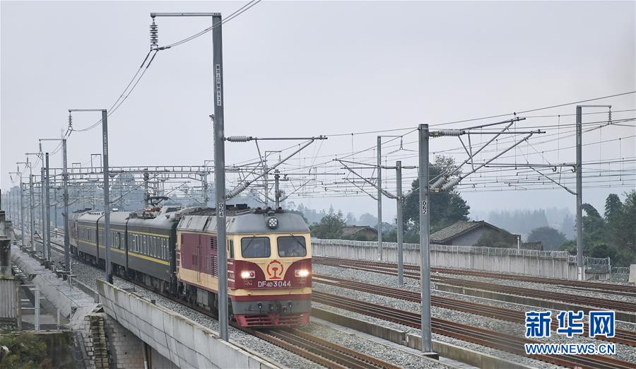 10月14日,試驗列車在位于成都市蒲江縣境內(nèi)的成雅鐵路成朝段上行駛。新華社記者薛玉斌攝
