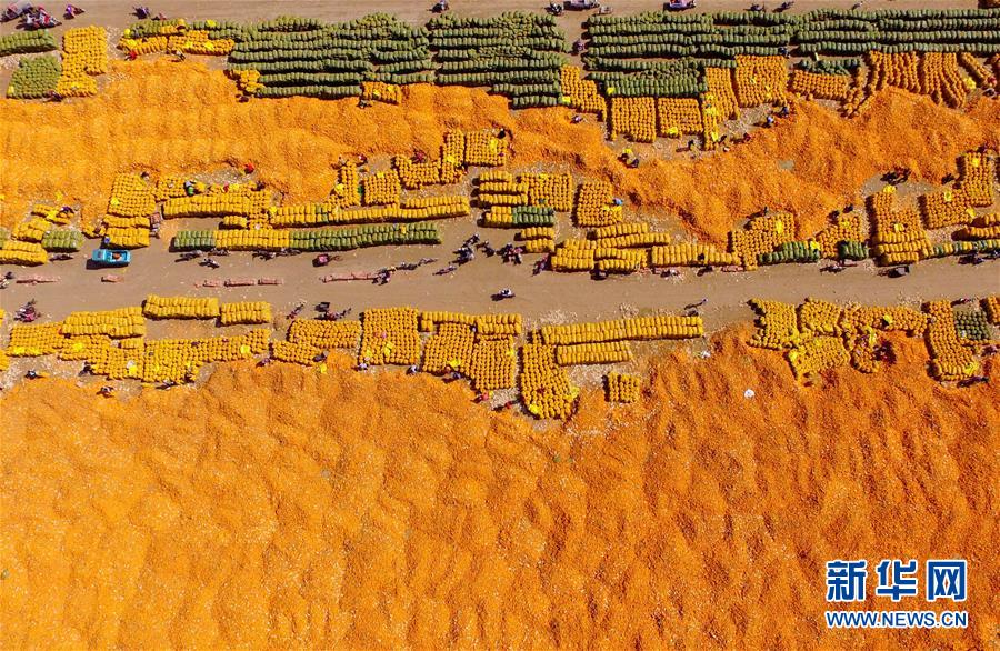 10月14日,河北省南和縣閆里鄉(xiāng)閆里村農民在晾曬收獲的玉米(無人機拍攝)。