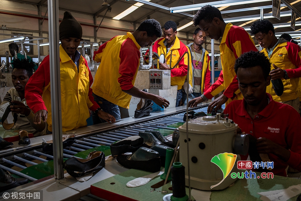 當(dāng)?shù)貢r(shí)間2018年8月1日,埃塞俄比亞。埃塞俄比亞首都亞的斯亞貝巴南部郊外,有一座東方工業(yè)園,這是中國(guó)在埃塞俄比亞的首個(gè)國(guó)家級(jí)境外經(jīng)貿(mào)合作區(qū)。園區(qū)占地5平方公里,連接著兩個(gè)60萬(wàn)人口的城鎮(zhèn),目前已經(jīng)有85家企業(yè)入駐,行業(yè)涉及紡織、服裝、制鞋、鋼筋、水泥、制藥、汽車組裝等,這些企業(yè)絕大部分來(lái)自中國(guó)。圖為鞋廠工人在2015年啟用的新廠區(qū)內(nèi)工作。
