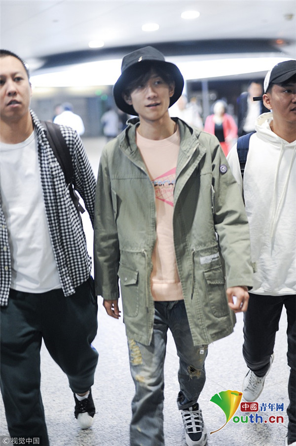 2018年10月14日,上海,張一山抵達(dá)上海機場。張一山戴漁夫帽眼袋嚴(yán)重瞬間老十歲, 用手擋臉?biāo)撇辉干乡R。