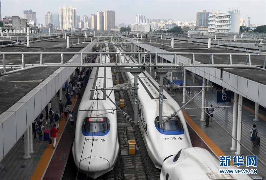 在廣西南寧站,旅客進入站臺準備乘坐動車出行(9月4日攝)。 廣西壯族自治區(qū)成立60年來,鐵路建設發(fā)生翻天覆地的變化。來自中國鐵路南寧局集團有限公司的數(shù)據(jù)顯示,1958年廣西鐵路總里程為1346.3公里,如今廣西鐵路總里程達5191公里。廣西與周邊相鄰省份間實現(xiàn)動車“公交化”開行。此外,北部灣港—重慶班列、東盟海產(chǎn)品冷鏈班列、“百色一號”果蔬專列等的開通和運營,強化了鐵路供給的針對性和有效性。鐵路成為助推廣西經(jīng)濟社會快速發(fā)展的“大動脈”。 新華社記者陸波岸攝