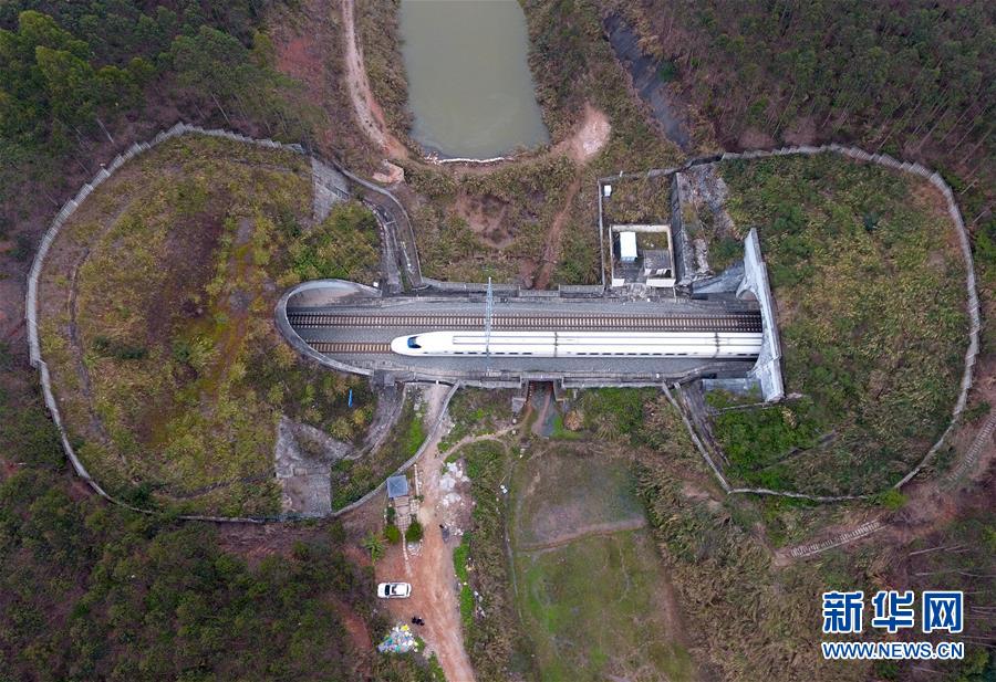 一列動車穿越南寧郊區(qū)一處隧道(2月11日無人機拍攝)。 廣西壯族自治區(qū)成立60年來,鐵路建設發(fā)生翻天覆地的變化。來自中國鐵路南寧局集團有限公司的數(shù)據(jù)顯示,1958年廣西鐵路總里程為1346.3公里,如今廣西鐵路總里程達5191公里。廣西與周邊相鄰省份間實現(xiàn)動車“公交化”開行。此外,北部灣港—重慶班列、東盟海產(chǎn)品冷鏈班列、“百色一號”果蔬專列等的開通和運營,強化了鐵路供給的針對性和有效性。鐵路成為助推廣西經(jīng)濟社會快速發(fā)展的“大動脈”。 新華社記者陸波岸攝