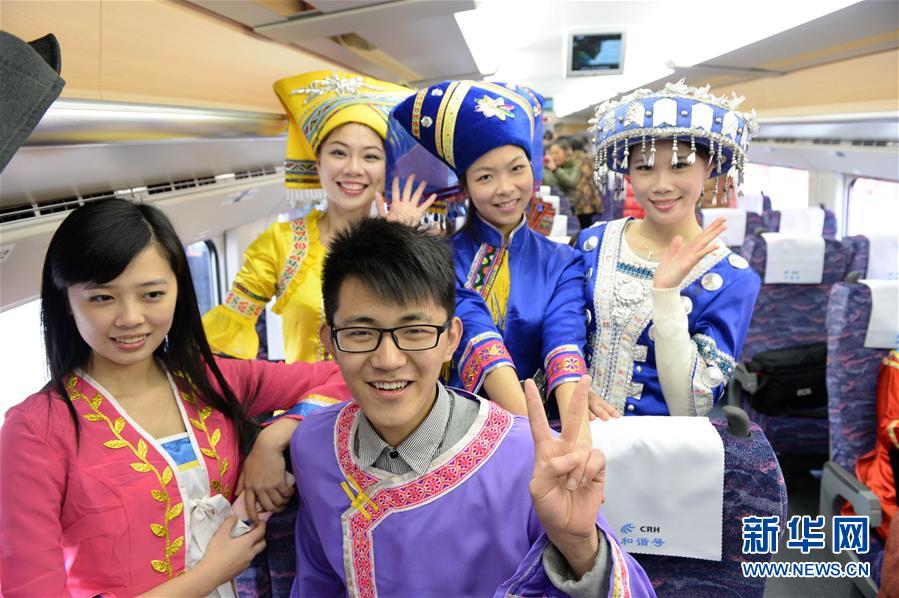 在廣西南寧站,身著民族服裝的乘客搭乘動車準備出行(2013年12月30日攝)。 廣西壯族自治區(qū)成立60年來,鐵路建設發(fā)生翻天覆地的變化。來自中國鐵路南寧局集團有限公司的數(shù)據(jù)顯示,1958年廣西鐵路總里程為1346.3公里,如今廣西鐵路總里程達5191公里。廣西與周邊相鄰省份間實現(xiàn)動車“公交化”開行。此外,北部灣港—重慶班列、東盟海產(chǎn)品冷鏈班列、“百色一號”果蔬專列等的開通和運營,強化了鐵路供給的針對性和有效性。鐵路成為助推廣西經(jīng)濟社會快速發(fā)展的“大動脈”。 新華社記者周華攝