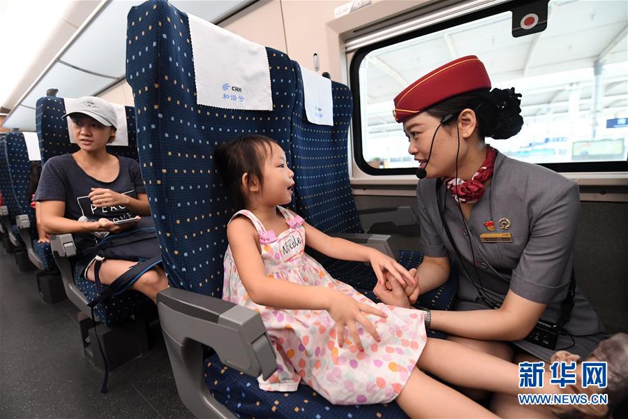 在南寧東站,一名列車工作人員在和一名小朋友交流(2017年8月5日攝)。 廣西壯族自治區(qū)成立60年來(lái),鐵路建設(shè)發(fā)生翻天覆地的變化。來(lái)自中國(guó)鐵路南寧局集團(tuán)有限公司的數(shù)據(jù)顯示,1958年廣西鐵路總里程為1346.3公里,如今廣西鐵路總里程達(dá)5191公里。廣西與周邊相鄰省份間實(shí)現(xiàn)動(dòng)車“公交化”開行。此外,北部灣港—重慶班列、東盟海產(chǎn)品冷鏈班列、“百色一號(hào)”果蔬專列等的開通和運(yùn)營(yíng),強(qiáng)化了鐵路供給的針對(duì)性和有效性。鐵路成為助推廣西經(jīng)濟(jì)社會(huì)快速發(fā)展的“大動(dòng)脈”。 新華社記者陸波岸攝