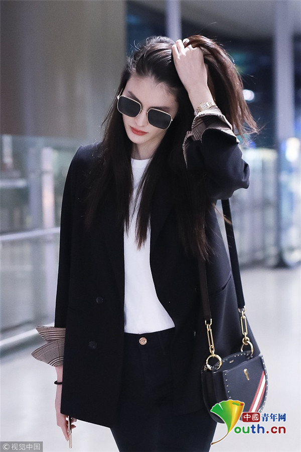2018年10月15日,上海,何穗亮相機(jī)場。她身穿深色西裝搭配黑色緊身褲大秀超模身材,簡約造型依舊高級感十足,輕撩秀發(fā)散發(fā)女人味。