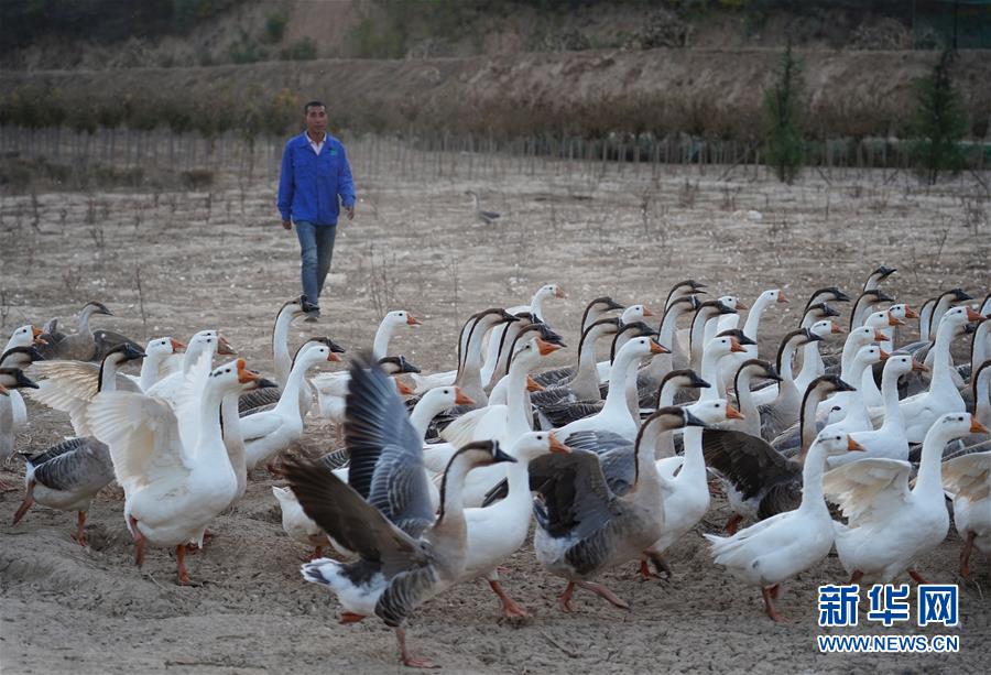 10月15日,技術(shù)員李子英在黃連河村林下生態(tài)產(chǎn)業(yè)園內(nèi)趕鵝。新華社記者王化娟 攝