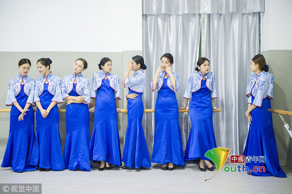 來(lái)自浙江傳媒學(xué)院的禮儀志愿者們正在進(jìn)行緊張有序的集中訓(xùn)練。圖片作者:浙江日?qǐng)?bào) 馮賀/視覺中國(guó)
