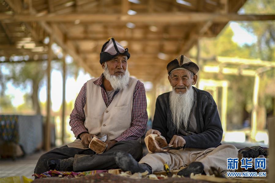 10月16日,在羅布人村寨,村民蘇來曼·托合提(左)和買買提·庫(kù)爾班在手工制作“卡盆”(用一根胡楊木鑿空而成的獨(dú)木舟)模型。 新華社記者 趙戈 攝