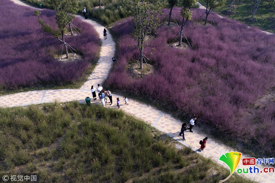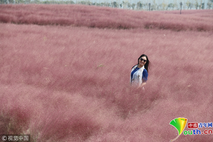 中國(guó)青年網(wǎng)北京10月7日電 2018年10月6日,游客在“粉色田野”里游玩、留影。粉黛亂子草是一種觀賞草種,該植物夏季為主要生長(zhǎng)季,全株綠色,花期為9月中旬至11月中旬,開花時(shí),綠葉為底,粉紫色花穗如發(fā)絲從基部長(zhǎng)出,遠(yuǎn)看如紅色云霧。