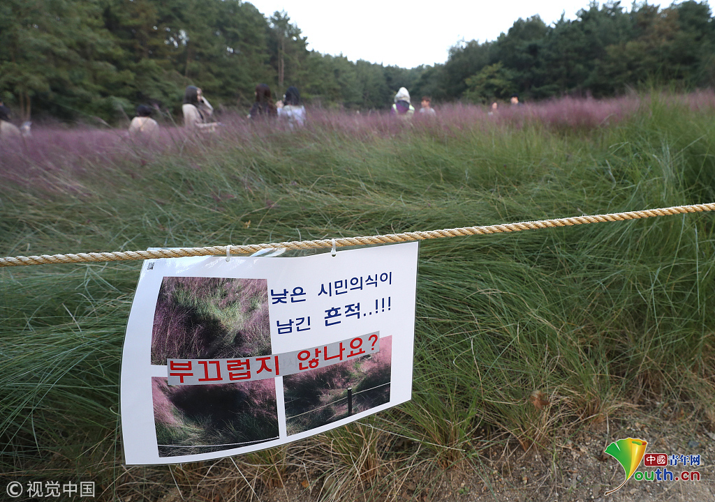 韓國(guó)蔚山,近日,蔚山公園大片粉黛亂子草盛開,但部分花海遭游客隨意踩踏。公園并沒有修復(fù)遭破壞區(qū)域,而是用繩索圍起并掛上批判性告示,呼吁游客腳下留情。圖片作者:Yonhap News Agency