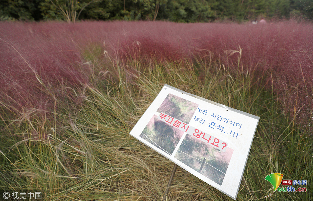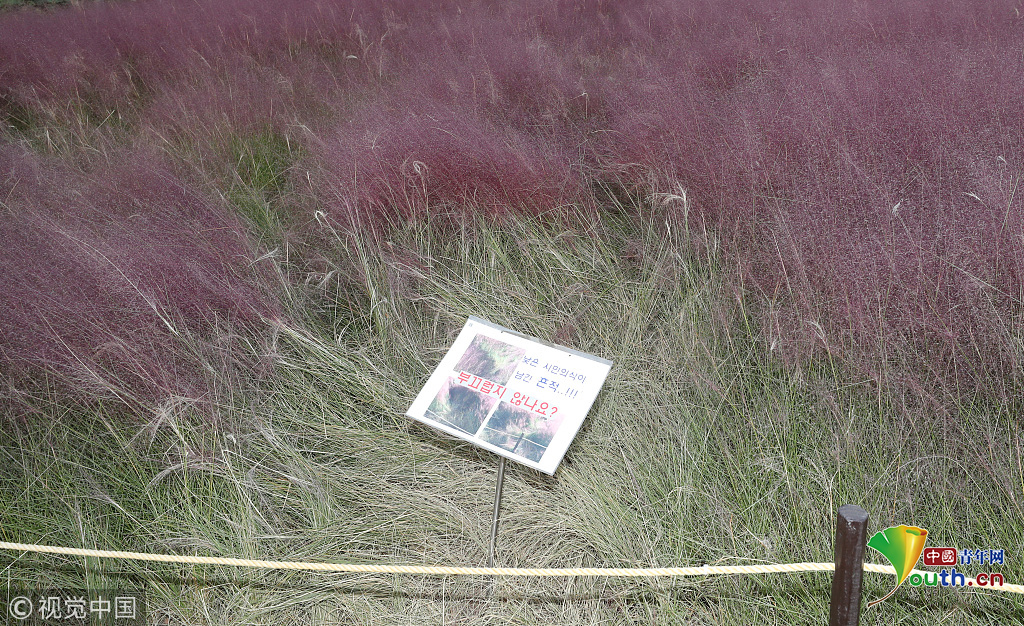 當(dāng)?shù)貢r(shí)間2018年10月16日,韓國(guó)蔚山,近日,蔚山公園大片粉黛亂子草盛開,粉紅花海浪漫十足,但部分花海遭游客隨意踩踏。公園并沒有修復(fù)遭破壞區(qū)域,而是用繩索圍起并掛上批判性告示,呼吁游客腳下留情。圖片作者:Yonhap News Agency