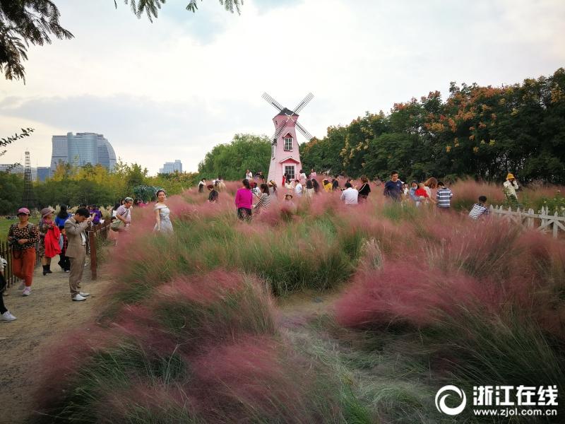 游客在生態(tài)樂園粉黛亂子草中的風(fēng)車。