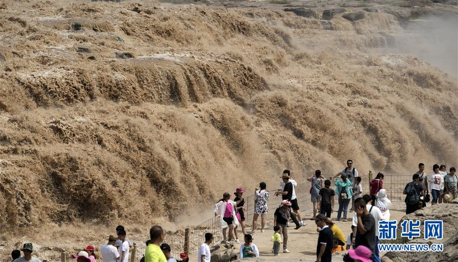 7月19日,游客在陜西境內(nèi)的壺口瀑布群前留影。 新華社記者陶明 攝