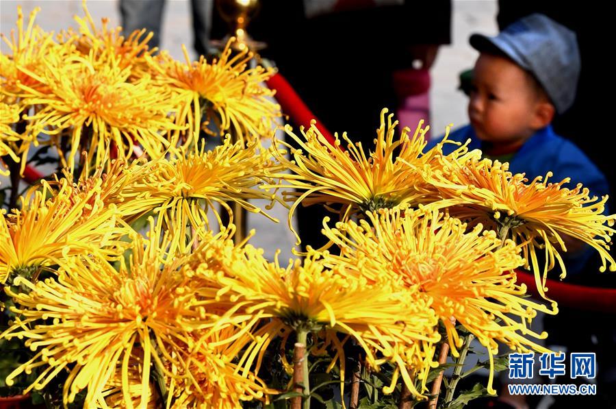 10月17日,一名小朋友在開(kāi)封龍亭公園內(nèi)觀看菊花。重陽(yáng)時(shí)節(jié),各色菊花競(jìng)相綻放,把古都開(kāi)封裝點(diǎn)得分外秀美,吸引眾多游客前來(lái)觀賞游玩。  新華社記者 李安 攝