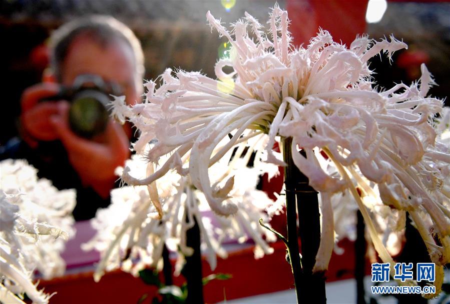 10月17日,游客在開封清明上河園內拍攝展出的菊花。重陽時節(jié),各色菊花競相綻放,把古都開封裝點得分外秀美,吸引眾多游客前來觀賞游玩。 新華社記者 李安 攝