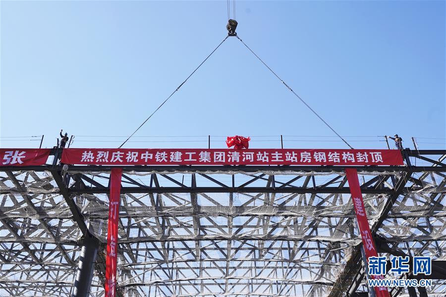 10月17日,工作人員在吊裝鋼梁。當(dāng)日,京張高鐵新建車站——清河站主體結(jié)構(gòu)正式封頂。清河站是京張高鐵建筑面積最大的車站,同時也是京張高鐵在北京地區(qū)的始發(fā)站之一。 新華社記者 邢廣利 攝