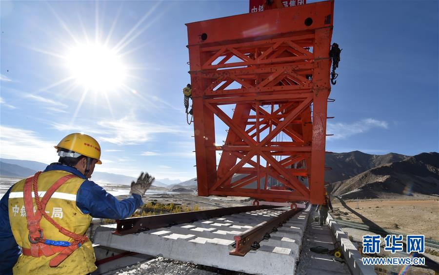 中鐵十一局的工人在川藏鐵路拉林段昌果特大橋進(jìn)行鋪軌作業(yè)(10月16日攝)。 近日,川藏鐵路拉薩至林芝段昌果特大橋開始鋪設(shè)行軌排、架設(shè)梁片,標(biāo)志著川藏鐵路拉林段正式進(jìn)入鋪軌階段。 新華社記者 覺果 攝