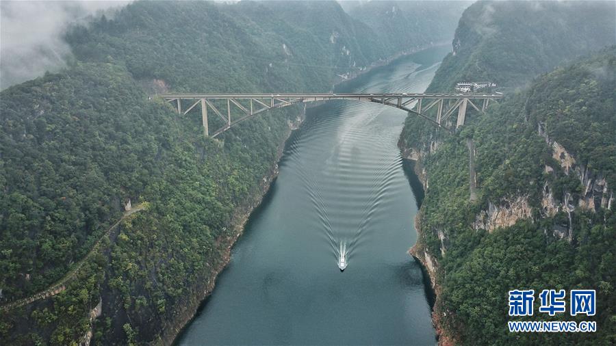 10月18日無人機(jī)航拍的江界河大橋。 當(dāng)日,位于貴州甕安縣的江界河大橋云霧環(huán)繞,景美如畫。 新華社記者歐東衢攝