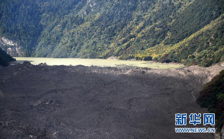 空中俯瞰堰塞湖和堰塞體(10月18日攝)。