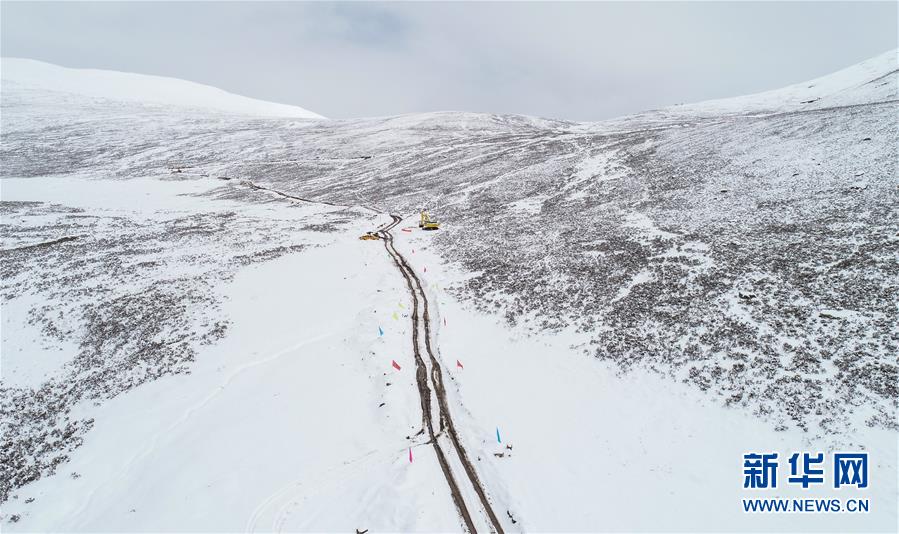 工作人員駕駛大型機(jī)械在昌都市江達(dá)縣的高山牧場(chǎng)上搶通道路(10月14日攝)。新華社記者 劉東君 攝