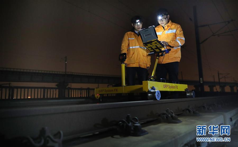 10月18日,劉訓(xùn)飛(右)和郎海鵬在滬寧城際上海安亭北線路所42#道岔上使用軌檢小車檢測(cè)線路。 新華社記者 方喆 攝