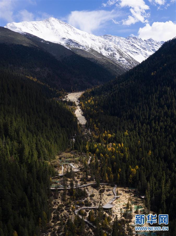 黃龍溝在藍(lán)天白云、雪山和彩林的映襯下風(fēng)景如畫(10月19日無人機攝)。深秋時節(jié),在雪山、藍(lán)天、白云和彩林映襯下,黃龍溝中的彩池色彩更加斑斕,目前黃龍景區(qū)進(jìn)入觀賞最佳時節(jié)。黃龍風(fēng)景名勝區(qū)位于四川省松潘縣境內(nèi),以彩池、灘流、雪山、峽谷、森林等聞名,享有“人間瑤池”“圣地仙境”之美譽。新華社記者 江宏景攝