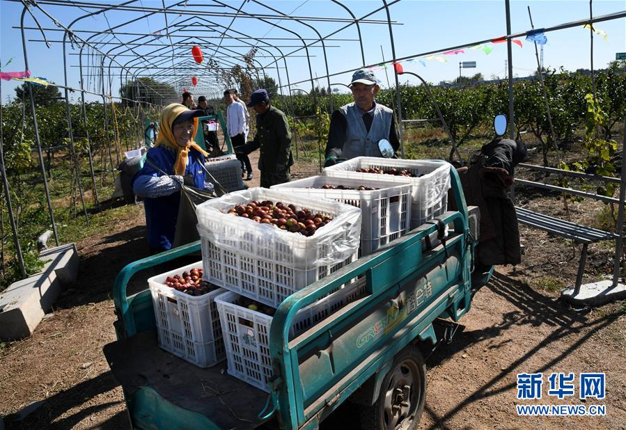 10月17日,在山東省青島市即墨區(qū)藍村鎮(zhèn)王演莊北村,種植戶在果園里收集采摘的大棗。 金秋時節(jié),農(nóng)民們忙著收獲成熟的農(nóng)作物,喜迎豐收。 新華社記者 李紫恒攝