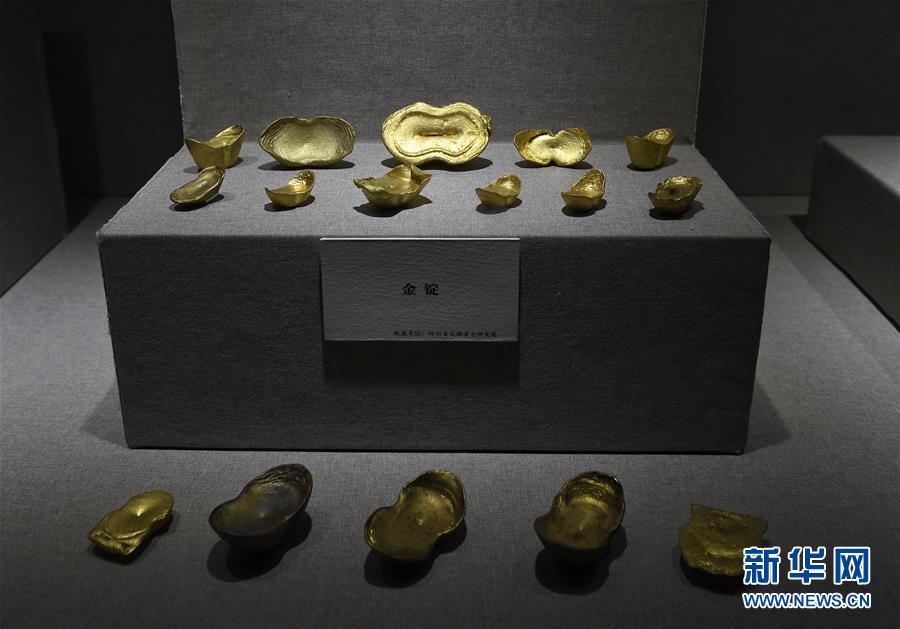 這是在四川博物院展出的金錠(10月21日攝)。 當日,由四川省文化廳、四川省文物局、眉山市人民政府主辦的“江口沉銀——四川彭山江口古戰(zhàn)場遺址考古成果展”在四川博物院開幕。此次展覽共展出文物521件,展期將持續(xù)至2019年1月18日。四川彭山江口古戰(zhàn)場遺址是2017年度全國十大考古新發(fā)現(xiàn)之一,共發(fā)現(xiàn)文物42000余件。 新華社記者劉坤攝