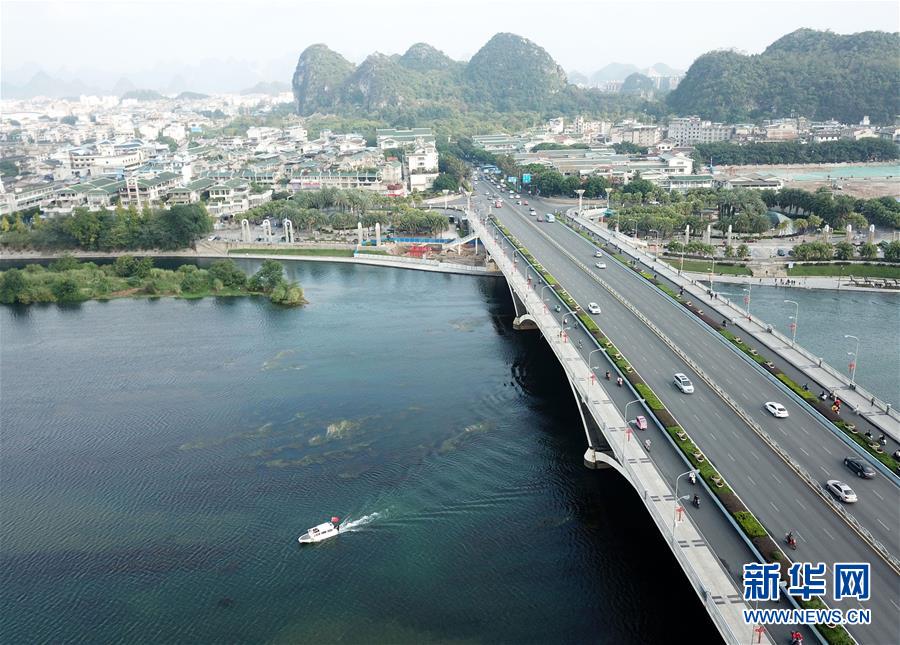 船只從橫跨漓江的廣西桂林市解放橋旁駛過(10月17日無人機拍攝)。 江作青羅帶,山如碧玉簪。1100多年前,唐朝詩人韓愈寫盡桂林山水之美。千百年來,桂林的青山綠水成為歷朝歷代文人騷客筆下的“人間仙境”。 保護好桂林山水,既是對祖國大好河山負責,更是對歷史負責。近年來,尤其是黨的十八大以來,桂林嚴守生態(tài)底線,以前所未有的力度截污治河,保護漓江最美山水,推動城鄉(xiāng)統(tǒng)籌協(xié)調發(fā)展,不斷擴大對外開放合作力度,努力在青山綠水里走出一條生態(tài)文明路。 新華社記者 周華 攝