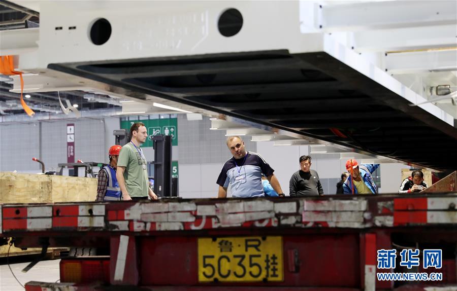 10月22日,“金牛座”龍門(mén)銑床床身(前)等待裝運(yùn)。 當(dāng)日,來(lái)自德國(guó)的首屆進(jìn)口博覽會(huì)最大展品——“金牛座”龍門(mén)銑床完成初步組裝,將運(yùn)往國(guó)家會(huì)展中心(上海)3號(hào)館進(jìn)行最后的安裝施工。這是德國(guó)瓦德里??票す狙邪l(fā)的機(jī)床設(shè)備,高約8米,占地面積約200平方米,將在智能及高端裝備區(qū)進(jìn)行展出。 新華社記者方喆攝