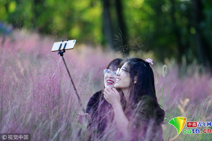 中國(guó)青年網(wǎng)北京10月7日電 2018年10月6日,游客在“粉色田野”里游玩、留影。粉黛亂子草是一種觀賞草種,該植物夏季為主要生長(zhǎng)季,全株綠色,花期為9月中旬至11月中旬,開(kāi)花時(shí),綠葉為底,粉紫色花穗如發(fā)絲從基部長(zhǎng)出,遠(yuǎn)看如紅色云霧。