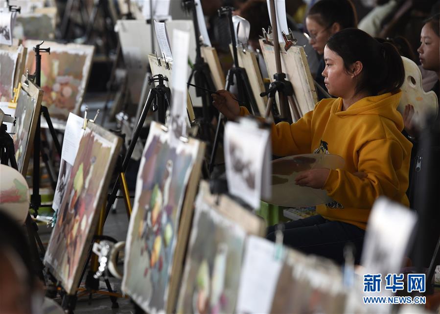 10月24日,考生在南京青藍畫室教學(xué)基地考點參加色彩科目模擬考試。 新華社記者孫參攝