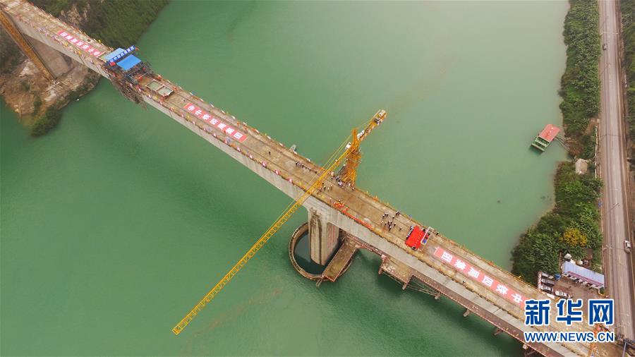 在重慶涪陵拍攝的渝懷鐵路涪秀二線重點(diǎn)工程——烏江右線大橋(10月23日無人機(jī)拍攝)。 10月23日,由中鐵四局承建的渝懷鐵路涪秀二線重點(diǎn)工程——烏江右線大橋主跨成功合龍,標(biāo)志著大橋主體工程全部順利結(jié)束。烏江右線大橋項目全程460.1米,主跨192米,跨越烏江和319國道。在兩年多的建設(shè)過程中,施工人員攻克了“不等高墩”“不對稱邊跨”“邊跨入隧”等多個技術(shù)難題。 新華社記者王全超攝