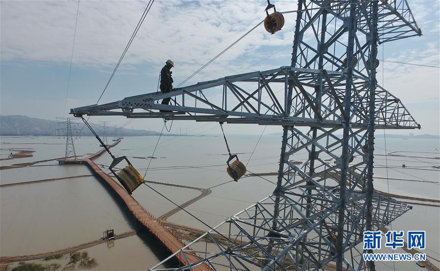10月25日,埭頭風(fēng)電送出工程施工人員在跨平海灣段的鐵塔上作業(yè)(無(wú)人機(jī)拍攝)。 新華社記者林善傳攝