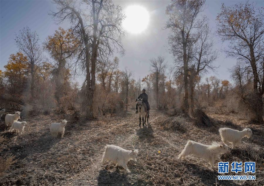 在新疆巴音郭楞蒙古自治州尉犁縣喀爾曲尕鄉(xiāng)的胡楊林里,牧羊人馬木提·買(mǎi)買(mǎi)提在放羊(10月25日攝)。 新華社記者 趙戈 攝