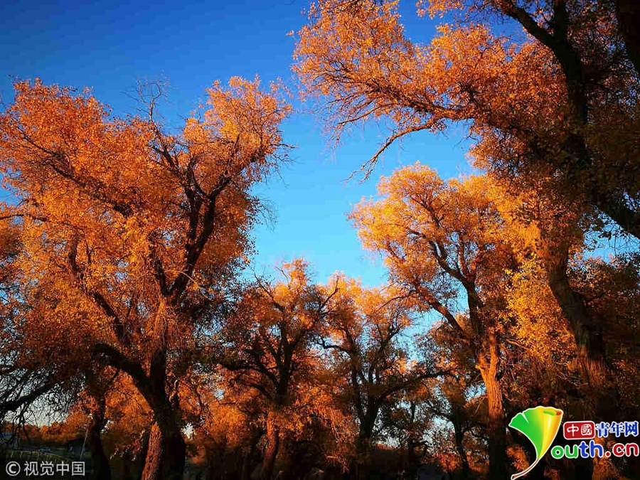 中國(guó)青年網(wǎng)北京10月9日電 2018年10月7日至8日,內(nèi)蒙古自治區(qū)阿拉善盟額濟(jì)納旗,地處巴丹吉林沙漠。額濟(jì)納河兩岸壯觀的胡楊林堪稱(chēng)大漠的一顆綠色明珠,每年深秋時(shí)節(jié)的第一場(chǎng)秋霜過(guò)后,大片的胡楊樹(shù)葉由綠變黃,一眼望去,陽(yáng)光下金色的樹(shù)葉襯著湛藍(lán)的天空于風(fēng)中婆娑起舞,鮮明的影調(diào),亮麗的色彩,令人流連忘返。
