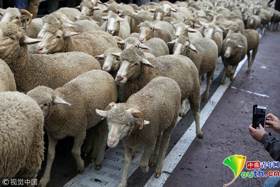 牧羊人驅(qū)趕成百上千只綿羊穿越馬德里市街。