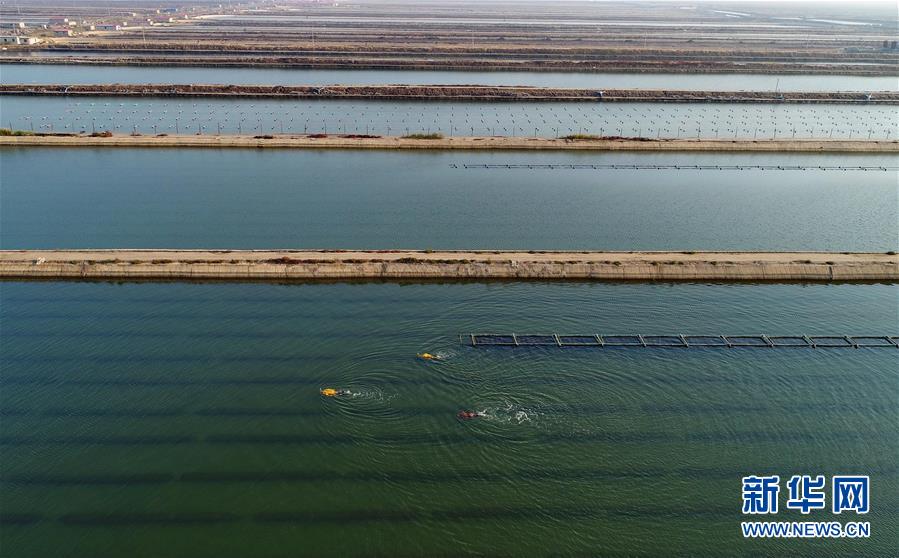 10月22日,樂(lè)亭縣姜各莊鎮(zhèn)二節(jié)村海參養(yǎng)殖基地的工人在捕撈海參(無(wú)人機(jī)拍攝)。 時(shí)下,正值渤海灣地區(qū)海參收獲時(shí)節(jié),河北省樂(lè)亭縣的海參養(yǎng)殖戶忙著捕撈海參,供應(yīng)各地市場(chǎng)。據(jù)介紹,該縣海域水質(zhì)優(yōu)良、氣候適宜,是海參養(yǎng)殖的理想場(chǎng)地,目前發(fā)展池塘造礁養(yǎng)殖海參面積6萬(wàn)畝,年產(chǎn)鮮活海參6000多噸,年產(chǎn)值2億多元。 新華社記者 楊世堯 攝