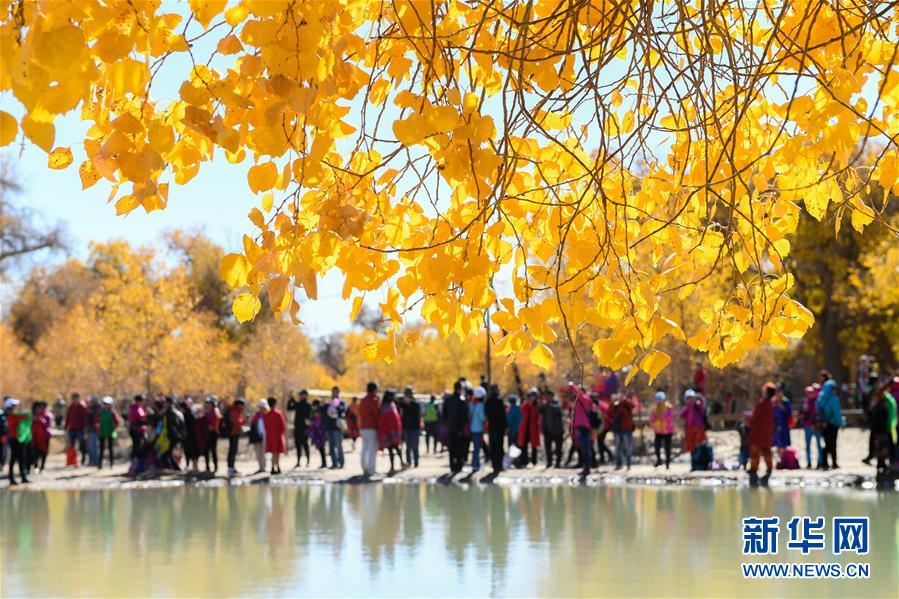 大片的胡楊樹葉由綠變黃,一眼望去,陽光下金色的樹葉襯著湛藍的天空于風中婆娑起舞。